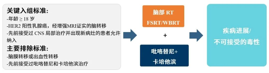 BROPTIMA研究是一项单中心、单臂、Ⅱ期临床研究(NCT04582968)。入组HER2阳性经磁共振成像(MRI)证实的脑转移患者。患者入组后根据方案接受放疗联合吡咯替尼(400 mg,qd)和卡培他滨(1000 mg/m2,bid,d1-14,q3w)治疗。其中放射治疗的方案由研究者根据脑转移灶的大小、数量以及脑实质病变的位置选择全脑放疗(WBRT 30 Gy/10fx)或分次立体定向放疗(FRST 8 Gy*3-5fx)。吡咯替尼和卡培他滨在放疗第一天至放射治疗疗程结束后7天内开始都是被允许的。研究的主要终点是1年CNS-PFS率,颅内病灶采用RANO-BM评估标准,颅外病灶采用RECIST 1.1评估标准。次要终点包括CNS-ORR、PFS、总生存期(OS)、安全性和认知功能评分。