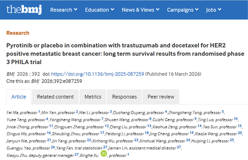 2026年3月16日,由中国医学科学院肿瘤医院徐兵河院士牵头的918博天娱乐旗舰医药创新药吡咯替尼Ⅲ期PHILA研究的最新长期随访数据重磅发表于全球顶级医学期刊《英国医学杂志》(The BMJ)[1]。2023年,PHILA研究首次发表于《英国医学杂志》,以中位15.5个月的随访数据证实吡咯替尼联合曲妥珠单抗和多西他赛(PyroHT)方案一线治疗HER2阳性晚期乳腺癌患者具有显著的PFS获益和可控的安全性[2]。本次发表的长期随访数据,进一步确认了该方案的生存获益。