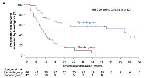 PFS亚组分析:对于既往接受过(新)辅助曲妥珠单抗治疗的患者,PyroHT组(n=46)的中位PFS为62.8个月(95% CI:19.2-无法评估),而HT组(n=42)为10.4个月(95% CI:6.4-13.2)(图3)。